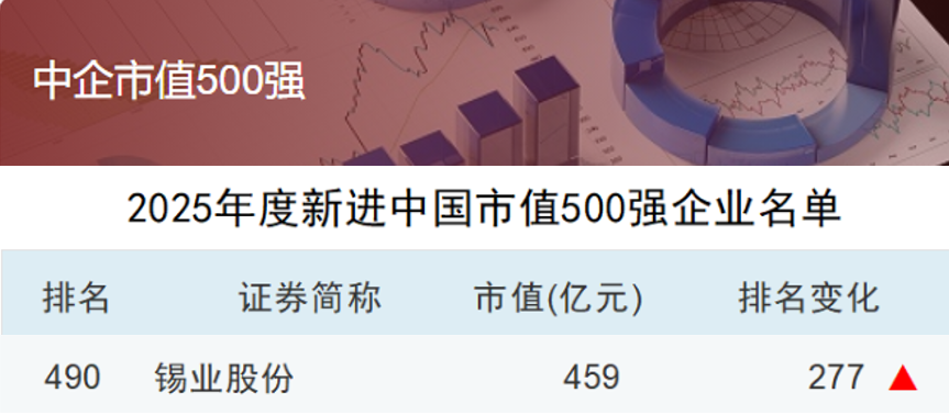 錫業(yè)股份新晉中國(guó)上市企業(yè)市值500強(qiáng)