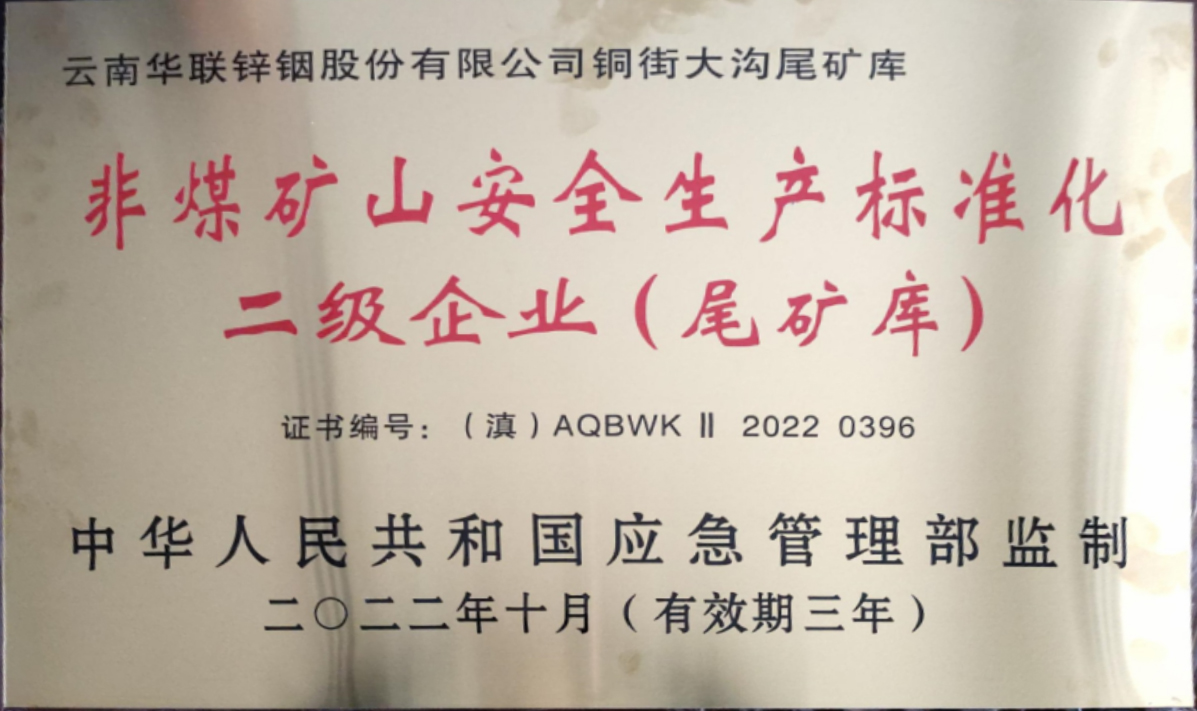 近日,華聯(lián)鋅銦公司銅街大溝尾礦庫、新田尾礦庫順利獲得“非煤礦山安全生產(chǎn)標(biāo)準(zhǔn)化二級企業(yè)”認(rèn)定,并收到由中華人民共和國應(yīng)急管理局監(jiān)制、云南省應(yīng)急管理廳頒發(fā)的牌匾和證書。為進(jìn)一步落實(shí)企業(yè)安全生產(chǎn)主體責(zé)任,華聯(lián)鋅銦公司緊緊圍繞“五個為零、兩個確保、一個不超”的安全生產(chǎn)目標(biāo),嚴(yán)格貫徹落實(shí)《安全生產(chǎn)法》,切實(shí)履行“黨政同責(zé)、一崗雙責(zé)、齊抓共管、失職追責(zé)”的安全生產(chǎn)責(zé)任,通過全員全過程參與,使公司安全生產(chǎn)標(biāo)...